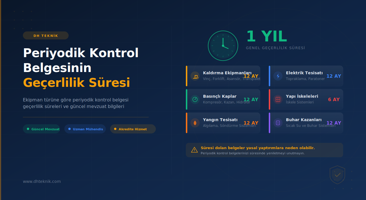 Periyodik kontrol belgesi kaç yıl geçerlidir? Periyodik kontrol belgesi genellikle 1 yıl geçerlidir. Ancak yapı iskeleleri gibi bazı ekipmanlarda bu süre 6 aya kadar kısalabilir.