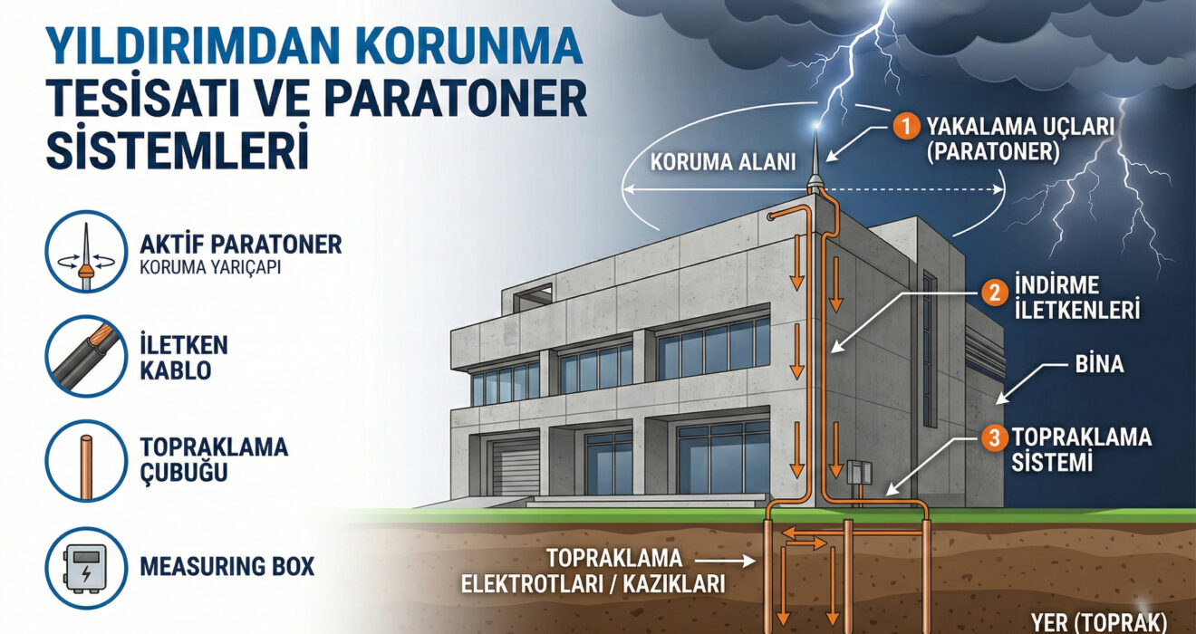 Yıldırımdan korunma tesisatı, bir yapıya isabet eden yıldırımın kontrollü bir şekilde toprağa iletilmesini sağlayan mühendislik sistemidir. Sistem temel olarak üç ana bileşenden oluşur: Yakalama sistemi (paratoner veya Faraday kafesi): Yıldırımı üzerine çekerek yakalar. Yapının en yüksek noktasına monte edilen bu bileşen, yıldırımın yapıya rastgele isabet etmesi yerine kontrollü bir şekilde sisteme yönelmesini sağlar. İletken sistemi (iniş iletkenleri): Yakalanan yıldırım enerjisini çatıdan toprağa doğru güvenli bir şekilde taşır. Bu iletkenler genellikle bakır veya galvanizli çelik malzemeden üretilir ve yapının dış cephesi boyunca iner. Topraklama sistemi: Yıldırım enerjisinin güvenli bir şekilde toprağa dağıtılmasını sağlar. Topraklama direncinin belirli değerlerin altında olması, sistemin etkin çalışması için kritik öneme sahiptir. TS EN 62305 standardına göre, yıldırımdan korunma topraklama tesisinin direnci en fazla 10 ohm olmalıdır.